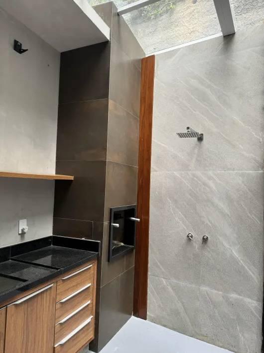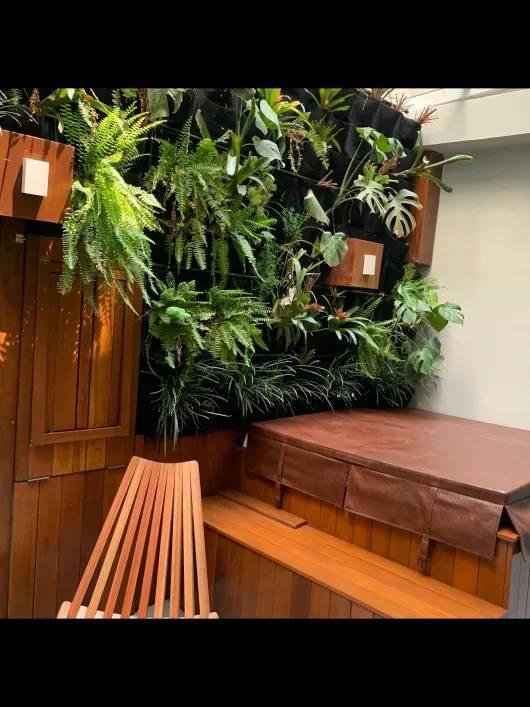 Área externa coberta com telhado de vidro retrátil, churrasqueira e hidromassagem original Jacuzzi, ainda na garantia de fábrica.