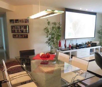 A área social do apartamento é ampla e confortável, com sala de estar, sala de jantar, sala de almoço e varanda. A cozinha é grande e bem equipada, com armários planejados e fogão de cooktop. O apartamento também tem 3 vagas de garagem na escritura.