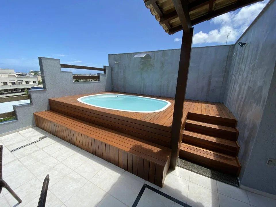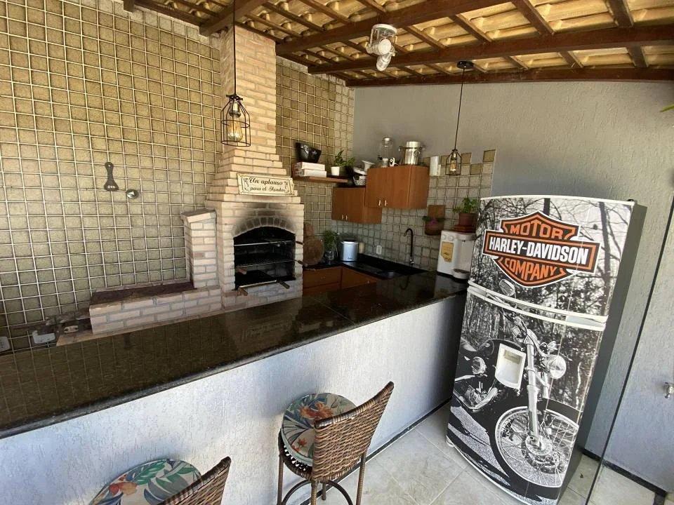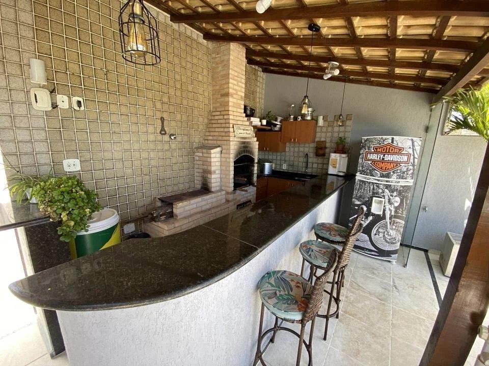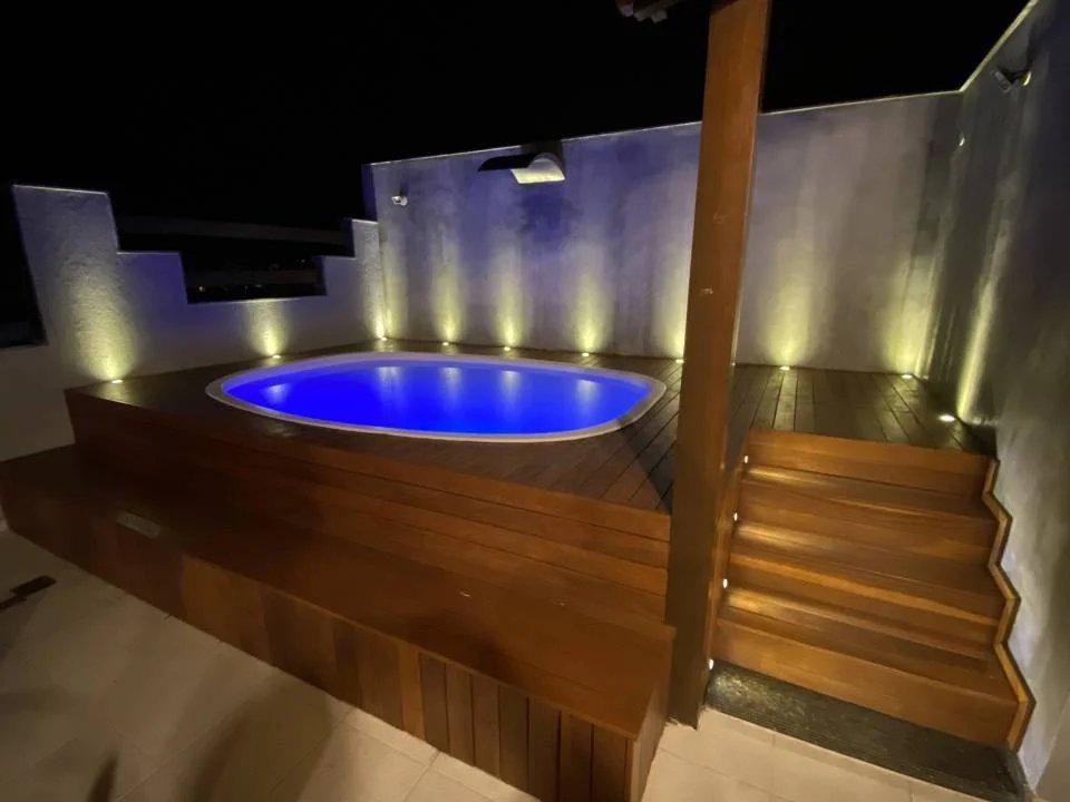 *2º pavimento:* Piscina com led, cascata e deck iluminado, churrasqueira e fogão à lenha, sauna, 4º quarto e *dependência empregada.*
